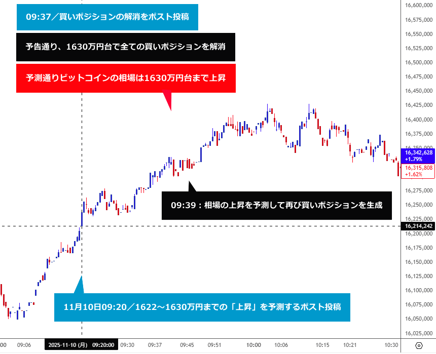 本日09時20分のポスト投稿後、BTC相場は予測通り、ポスト時点の1621万円台のレートから1630万円台まで上昇する値動きとなったため、予告通り、現物レート1630