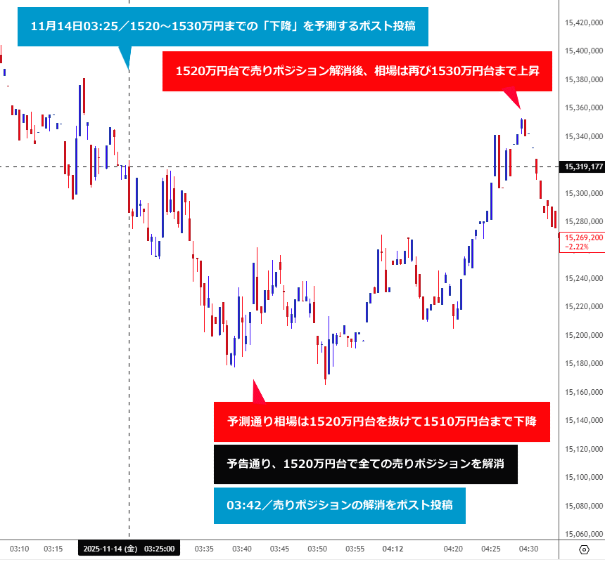 トレードの経過としては、ポスト投稿直前に建てていた売りポジションを保持し、予告通り、現物レート1520万円台で全てのポジションを解消(利確)後、その旨を追って投稿しています。
