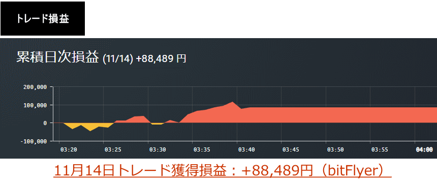 以下、この時に行ったトレードの収支結果です(以下の損益明細は11月14日の合計損益のため、ポスト投稿前のトレード損益も含まれています。)