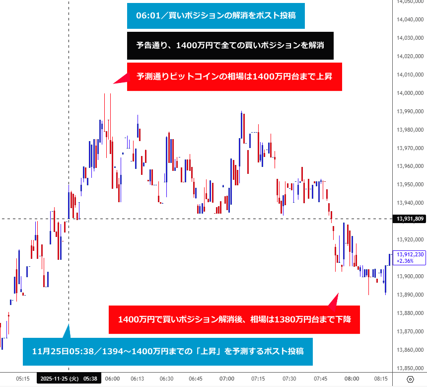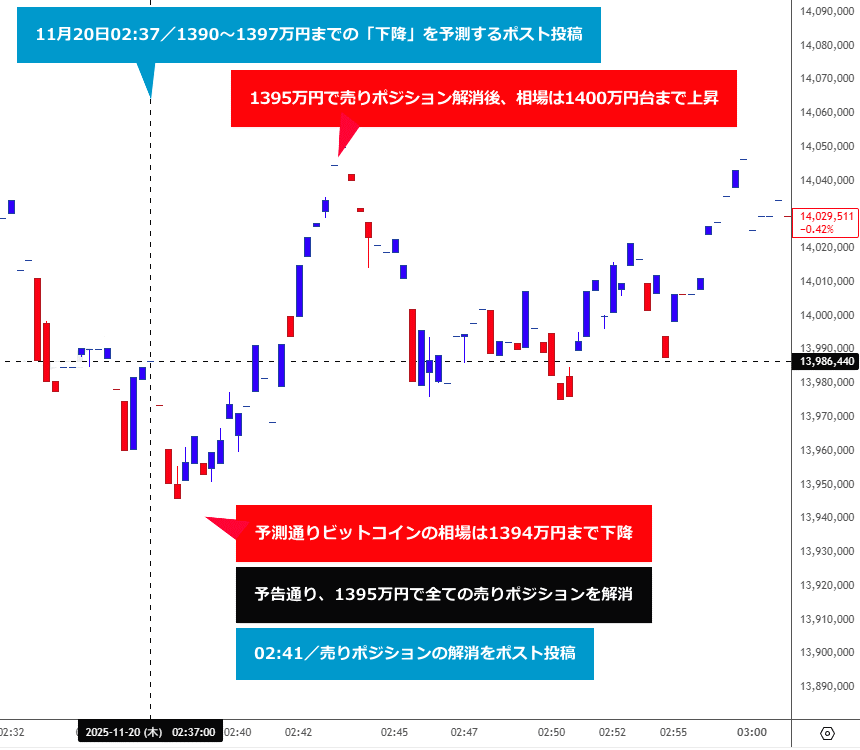 トレードの経過としては、ポスト投稿前に建てていた売りポジションを保持し、予測通り、現物レート1390万円で全てのポジションを解消(利確)後、その旨を追って投稿しています。