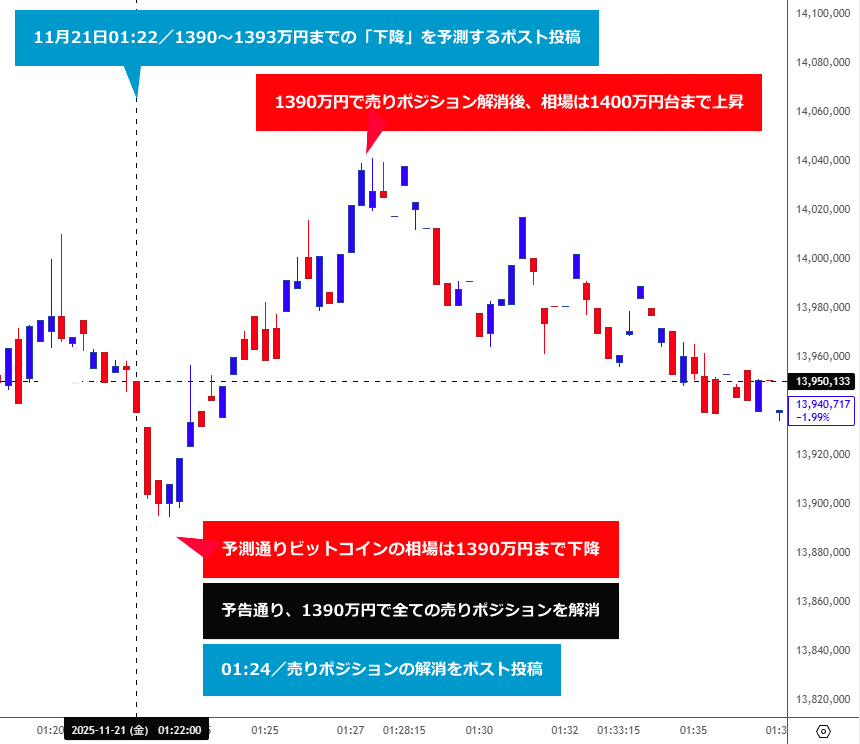 本日01時22分のポスト投稿後、BTC相場は予測通り、ポスト時点の1394万円台のレートから1390万円台を抜けて1389万円台まで下降する値動きとなったため、予告通り、現物レート1390万円で全ての売りポジションを解消しました(取引損益は後ほどご報告します)https://t.co/LsBzibKsHx