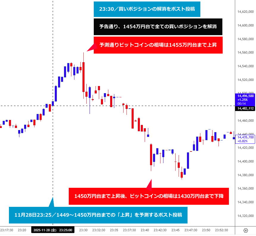 ポスト投稿後、BTC相場はポスト時点の1448万円台のレートを下回ることなく、予測通り、1455万円台まで上昇する値動きとなりました。