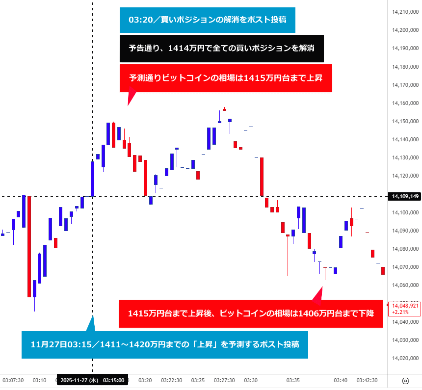 本日03時15分のポスト投稿後、BTC相場は予測通り、ポスト時点の1410万円台のレートから1415万円まで上昇する値動きとなったため、予告通り、現物レート1414万円で全ての買いポジションを解消しました(取引損益は後ほどご報告します)https://t.co/sP0kSGkpkS