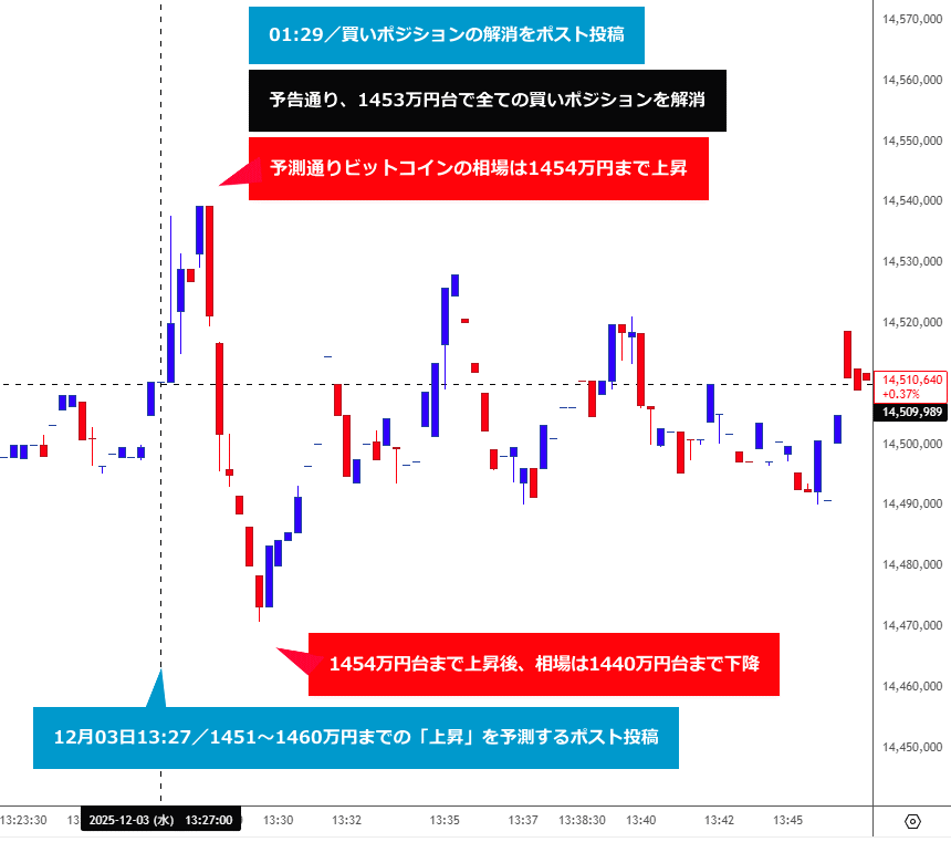 こちらのポストを投稿した12月03日13時27分の時点で1450円台だったビットコイン相場は、私のテクニカル分析において「1451~1460万円まで上昇する可能性が高い」」と予測しました。