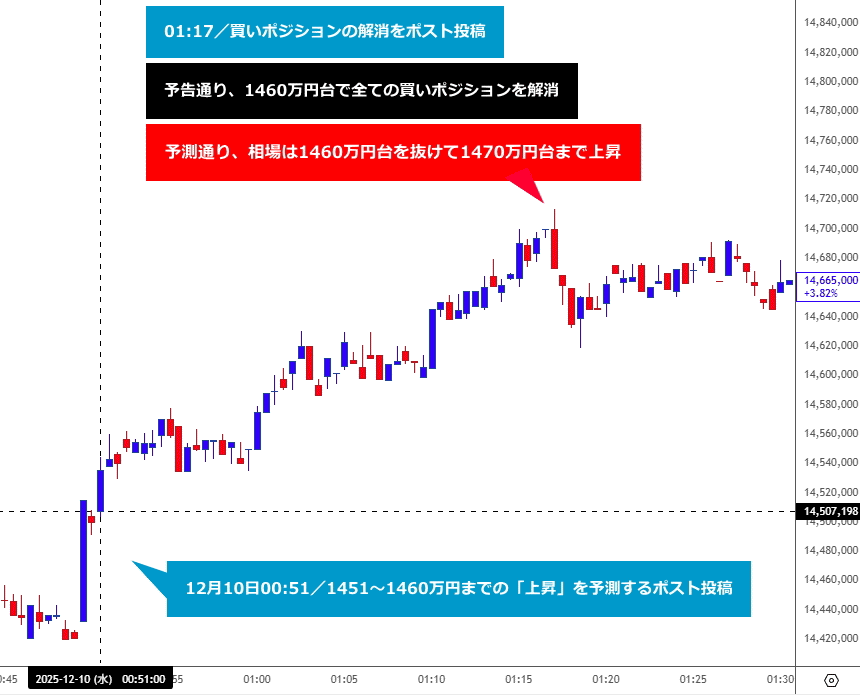 本日00時51分のポスト投稿後、BTC相場は予測通り、ポスト時点の1450万円台のレートから1460万円台を抜けて1470万円まで上昇する値動きとなったため、予告通り、現物レート1460万円台で全ての買いポジションを解消しました(取引損益は後ほどご報告します)https://t.co/R2u8qK5cRJ