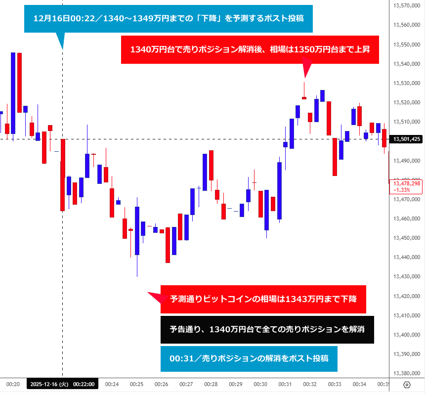 本日00時22分のポスト投稿後、BTC相場は予測通り、ポスト時点の1350万円台のレートから1340万円台まで下降する値動きとなったため、予告通り、現物レート1340万円台で全ての売りポジションを解消しました(取引損益は後ほどご報告します)https://t.co/nyK3Lx59nv
