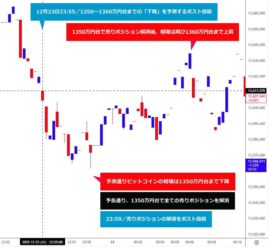 こちらのポストを投稿した12月23日23時55分の時点で1361万円台だったBTC相場は「1350~1360万円まで下降する可能性が高い」」と予測しました。