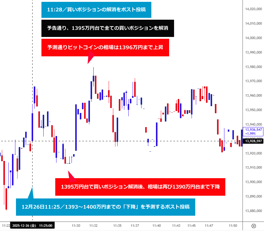 本日11時25分のポスト投稿後、BTC相場は予測通り、ポスト時点の1392万円台のレートから1396万円台まで上昇する値動きとなったため、予告通り、現物レート1395万円台で全ての買いポジションを解消しました(取引損益は後ほどご報告します)https://t.co/YwVeZnYo9l