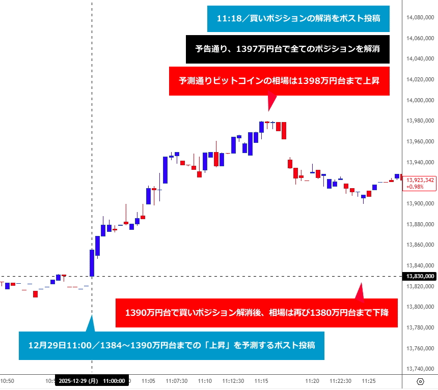 こちらのポストを投稿した12月29日11時00分の時点で1383万円台だったBTC相場は「1384~1390万円まで上昇する可能性が高い」と予測しました。